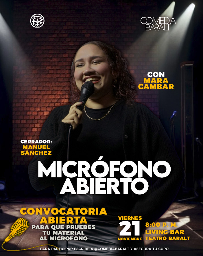 Demuestra tu talento en la comedia en el Teatro Baralt Cinthya Paez noviembre 19, 2025 CIUDAD, ESPECTÁCULOS, FARANDULA ¿Quieres poner a prueba tu talento en la comedia? El micrófono abierto de Comedia Baralt te ofrece la oportunidad de presentarte frente al público y demostrar tu talento.Esta edición contará con la participación especial de Mara Cambar y Manuel Sánchez, quienes acompañarán la jornada con su experiencia y estilo en tarima.Si deseas participar, puedes registrarte escribiendo directamente al DM de @comediabaralt para asegurar tu cupo.Lugar: Living Bar Fecha y hora: 21 de noviembre, 8:00 p. m. Entrada: 3$, en www.teatrobaralt.org