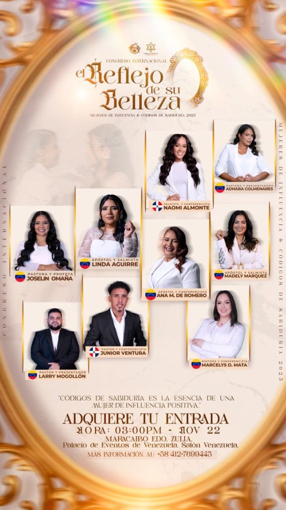 “El Reflejo de su belleza” Cinthya Paez noviembre 21, 2025 ESPECTÁCULOS Congreso de mujeres de influencia & Códigos de sabiduría presentan: “El Reflejo de su belleza”. En su cuarta edición vuelve el congreso mujeres de influencia pero en esta oportunidad de la mano de códigos de sabiduría, con un formato y visión que impactarán tu vida, ambas organizaciones deciden unirse para dar vida a un evento sin precedentes. Este movimiento es inspirado en la mujer sabia que edifica la casa , su vida , llamado y sociedad, la sabiduría es la esencia de una mujer de influencia positiva. Son los puntos principales que tocaran en dicha actividad, no dejando de mencionar que es un evento para toda la familia y también se brindarán diferentes herramientas útiles. Esta nueva edición viene cargada de grandes sorpresas e invitados especiales: Por Venezuela Pastora y Cantante Madely Márquez, Pastora, Joselin Omaña, Pastora y conferencista MARCELYS de mata desde Puerto Ordaz. Organizadores: Apóstoles Linda & Jovanny Bracho y Joel & Ana María de Romero, el pastor Larry mogollón quien también conducirá el evento junto a adhara colmenares. Desde República Dominicana: Cantante y conferencista Naomi Almonte, Pastor y conferencista Junior Ventura. “El Reflejo de su belleza” se llevará a cabo en las instalaciones del palacio de eventos de Maracaibo, desde las 3 PM. Para más información contacta 0412-7699445 y síguelas en sus redes sociales @mujeresdeinfluenciaoficia